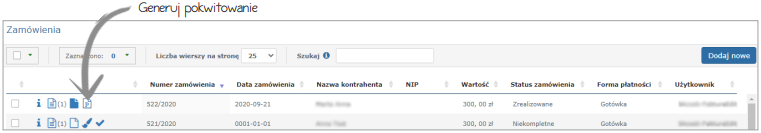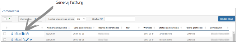 1. W tabeli zamówień kliknij na ikonkę Generuj fakturę.
