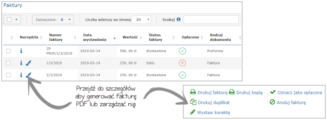 3. Wygenerowane faktury znajdują się w zakładce Faktury. Można tam zmienić ich status