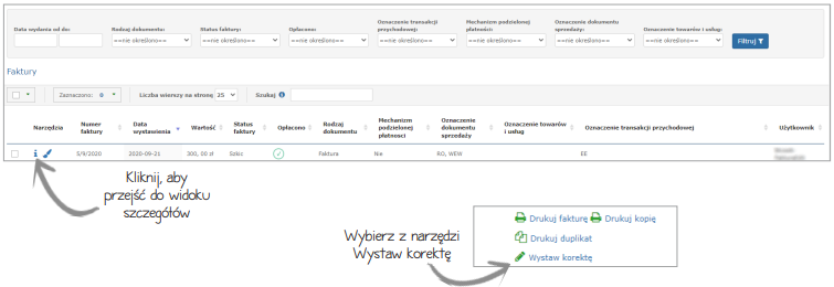 6. Jeżeli chcesz wygenerować korektę faktury, przejdź do zakładki Faktury a następnie kliknij na widok szczegółów faktury i wybierz Wstaw korektę.