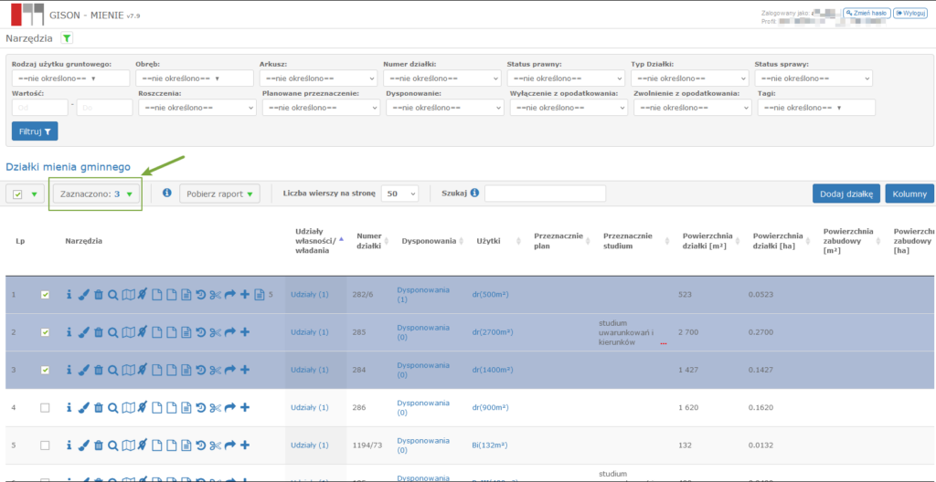 1. Zaznacz interesujące Cię działki, którym chcesz zmienić atrybuty. Następie kliknij